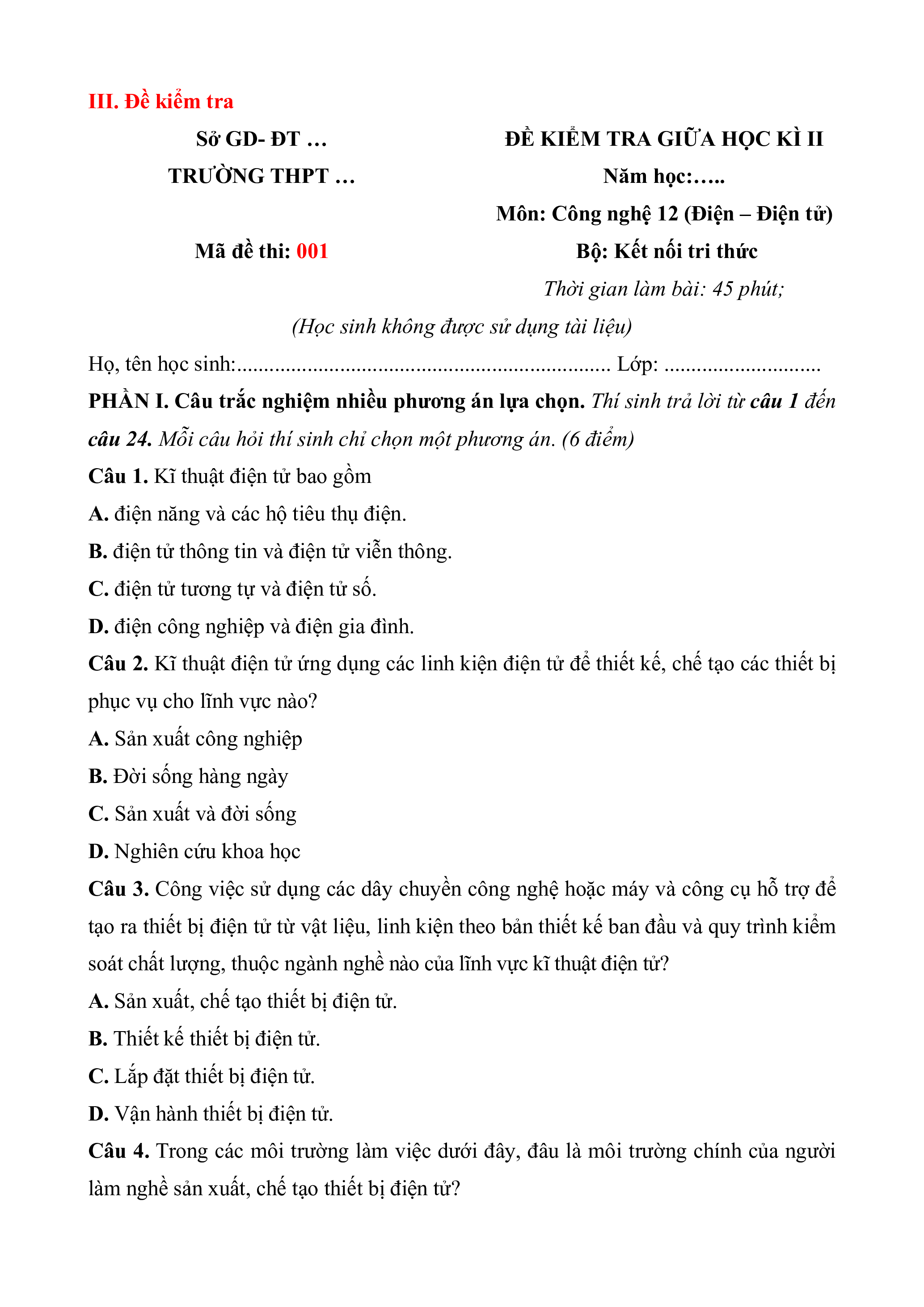 Môn: Công nghệ 12 (Điện – Điện tử) Mã đề thi: 001