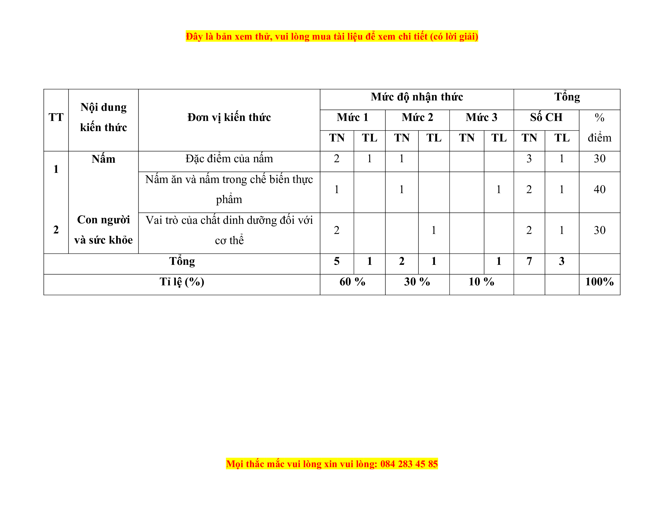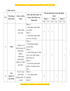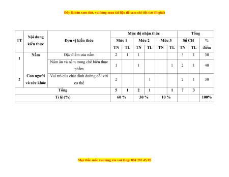 Đơn vị kiến thức Mức 1 Mức 2 Mức 3 Số CH % kiến thức TN TL TN TL TN TL TN TL điểm Nấm Đặc điểm của nấm 2 1 1 3 1 30 1