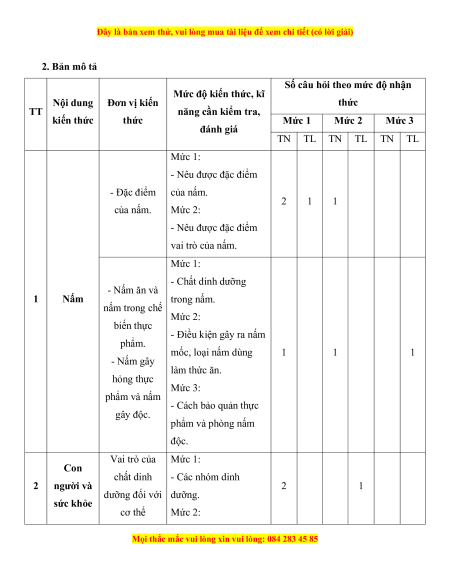 Mức độ kiến thức, kĩ Nội dung Đơn vị kiến thức TT năng cần kiểm tra, kiến thức thức Mức 1 Mức 2 Mức 3 đánh giá TN TL TN TL TN TL Mức 1: - Nêu được đặc điểm - Đặc điểm của nấm. 2 1 1 của nấm. Mức 2: - Nêu được đặc điểm vai trò của nấm. Mức 1: - Chất dinh dưỡng - Nấm ăn và 1 Nấm trong nấm. nấm trong chế Mức 2: biến thực - Điều kiện gây ra nấm phẩm. mốc, loại nấm dùng 1 1 1 - Nấm gây làm thức ăn. hỏng thực Mức 3: