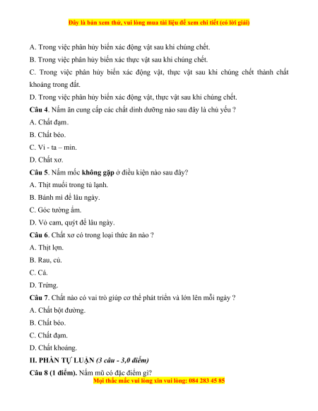 Câu 1. Nấm ít được tìm thấy nhất ở nơi nào sau đây? A. Gỗ mục. B. Lá cây mục. C. Lá cây xanh.