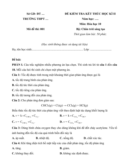 ĐỀ KIỂM TRA KẾT THÚC HỌC KÌ II TRƯỜNG THPT … Năm học: …. Môn: Hóa học 10 Mã đề thi: 001