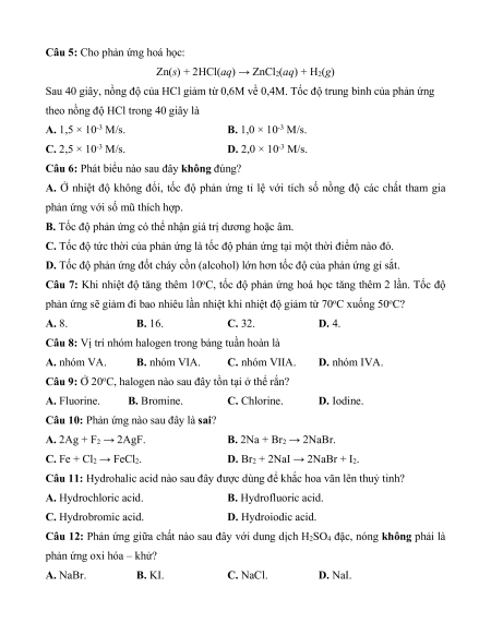 Câu 9: Ở 20oC, halogen nào sau đây tồn tại ở thể rắn? A. Fluorine. B. Bromine. C. Chlorine. D. Iodine.