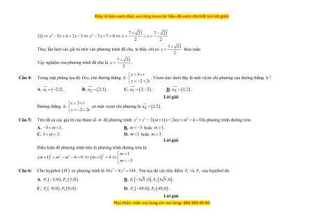 . Véctơ nào dưới đây là một véctơ chỉ phương của đường thẳng ? y = 2 − + 2t A. − − 1 u = ( 2 ) ;1 . B. u = 2 (2 ) ;1 . C. 3 u = (3; 2) . D. u = 4 (1;2). Câu 5: