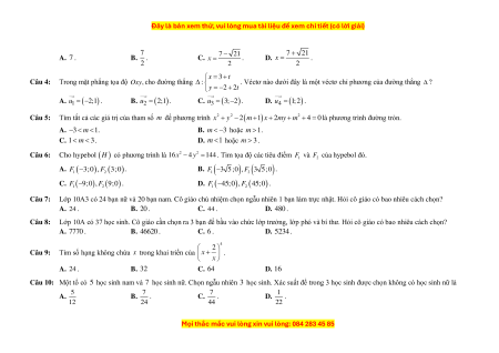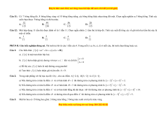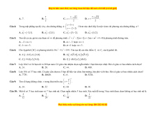 16x − 4 y = 144 . Tìm tọa độ các tiêu điểm F và F của hypebol đó. 1 2 A. F 3 − ;0 , F 3;0 . B. F 3 − 5;0 , F 3 5;0 . 1 ( ) 2( ) 1 ( ) 2 ( ) C. F 9 − ;0 , F 9;0 . D. F 4 − 5;0 , F 45;0 . 1 ( ) 2 ( ) 1 ( ) 2 ( ) Câu 7: