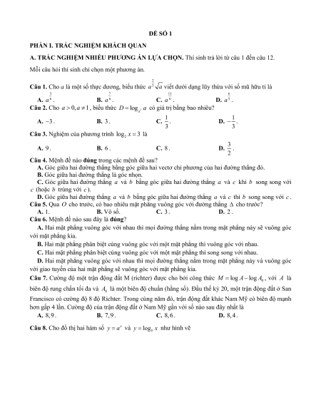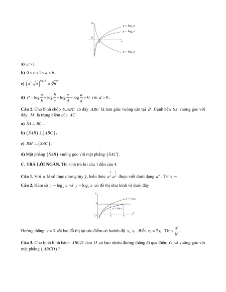 Câu 1. Cho các đồ thị hàm số y log x y x y x như hình vẽ. a ; logb ; logc a) a 1.