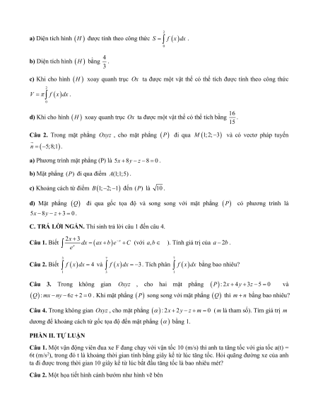 Vận tích phân vào giải dụng quyết bài toán C1 thực tiễn Nhận biết được công thức tính Biết diện tích hình phẳng và thể tích C6 C1a, C1c Bài của một số hình 13. khối Ứng Tính được diện dụng tích hình phẳng C1b, hình Hiểu và thể tích của C1d học một số hình khối của Vận dụng được tích kiến thức diện phân Vận tích hình phẳng dụng và thể tích của C2 một số hình khối vào giải quyết bài toán thực tiễn - Nhận biết được khái niệm vectơ Phương Bài pháp 14. pháp tuyến của C7, 2 tọa độ Phươn mặt phẳng trong g trình Biết C8, C2b C3 không mặt - Nhận biết được C9 gian phẳng dạng phương trình mặt phẳng