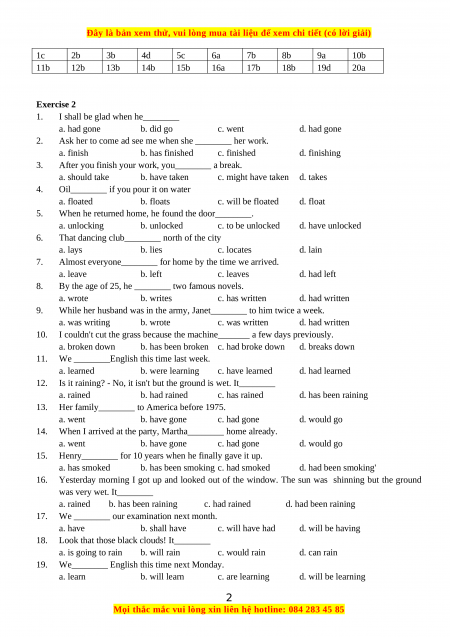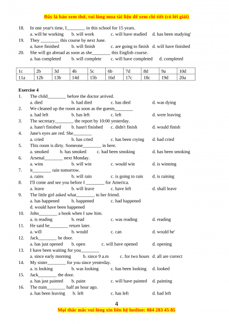 c. will have completed d. completed 1c 2b 3d 4b 5c 6b 7d 8d 9a 10d 11a 12b 13b 14d 15b 16d 17c 18c 19d 20a Exercise 4 1.