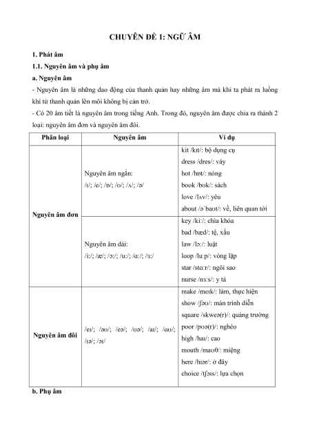 CHUYÊN ĐỀ 1: NGỮ ÂM 1. Phát âm 1.1. Nguyên âm và phụ âm a. Nguyên âm