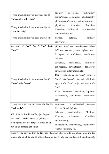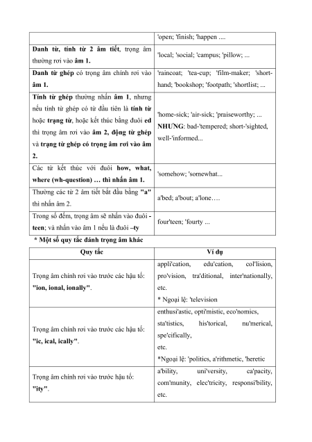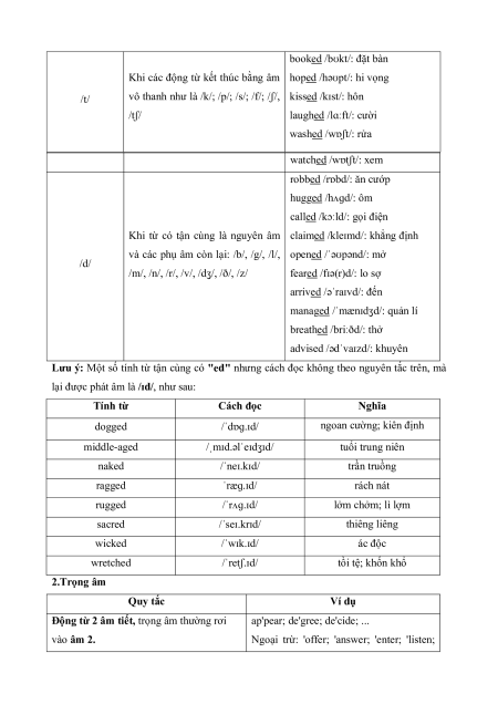 lại được phát âm là /ɪd/, như sau: Tính từ Cách đọc Nghĩa dogged /ˈdɒɡ.ɪd/ ngoan cường; kiên định middle-aged /ˌmɪd.əlˈeɪdʒɪd/ tuổi trung niên naked /ˈneɪ.kɪd/ trần truồng ragged ˈræɡ.ɪd/ rách nát rugged /ˈrʌɡ.ɪd/ lởm chởm; lì lợm sacred /ˈseɪ.krɪd/ thiêng liêng wicked /ˈwɪk.ɪd/ ác độc wretched /ˈretʃ.ɪd/ tồi tệ; khốn khổ 2.Trọng âm Quy tắc Ví dụ
