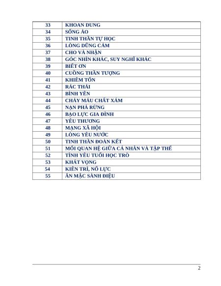 SỰ KHÁM PHÁ, TRẢI NGHIỆM 1 33 KHOAN DUNG 34 SỐNG ẢO 35 TINH THẦN TỰ HỌC 36 LÒNG DŨNG CẢM 37 CHO VÀ NHẬN 38