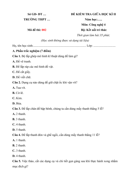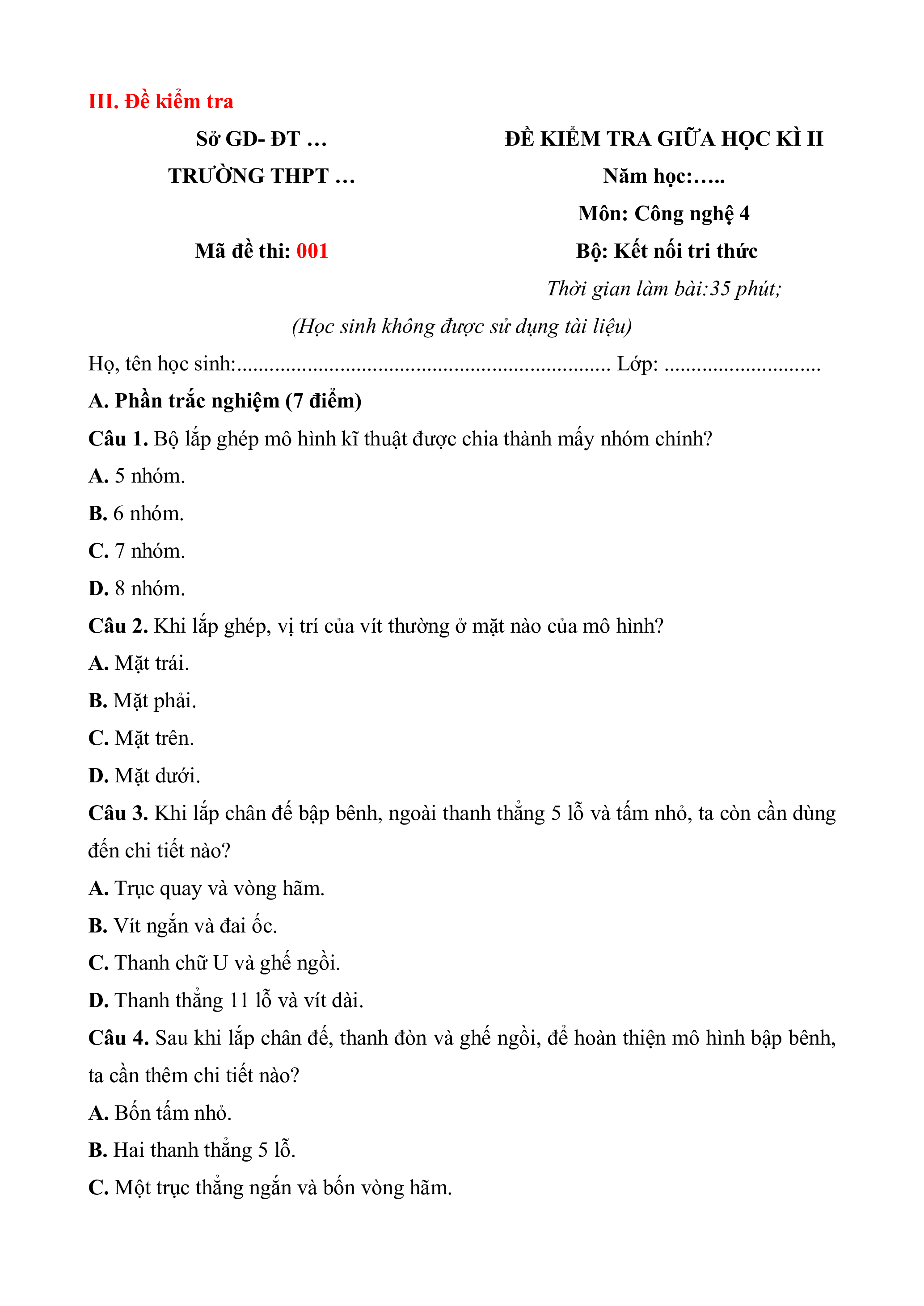 ĐỀ KIỂM TRA GIỮA HỌC KÌ II TRƯỜNG THPT … Năm học:…. Môn: Công nghệ 4 Mã đề thi: 001