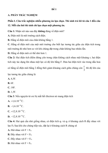 Câu 1: Nhận xét nào sau đây không đúng về điện môi?