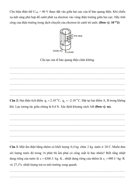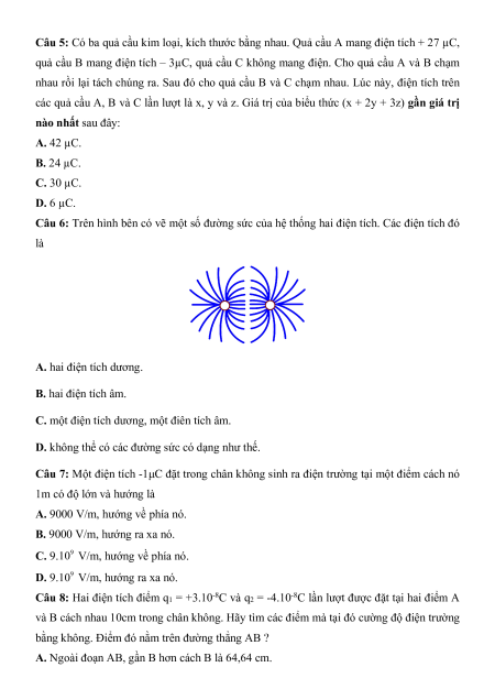 Câu 8: Hai điện tích điểm q1 = +3.10-8C và q2 = -4.10-8C lần lượt được đặt tại hai điểm A