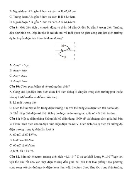Câu 9: Một điện tích q chuyển động từ điểm M đến Q, đến N, đến P trong điện Trường
