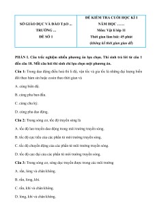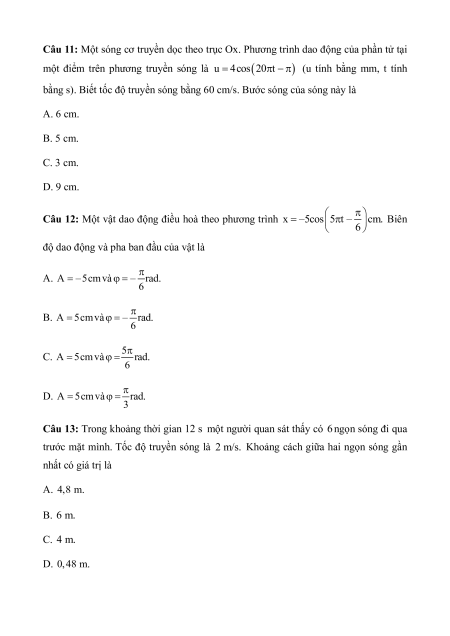bằng s). Biết tốc độ truyền sóng bằng 60 cm/s. Bước sóng của sóng này là A. 6 cm. B. 5 cm. C. 3 cm. D. 9 cm. Câu 12: