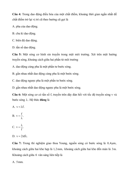 Câu 4: Trong dao động điều hòa của một chất điểm, khoảng thời gian ngắn nhất đề