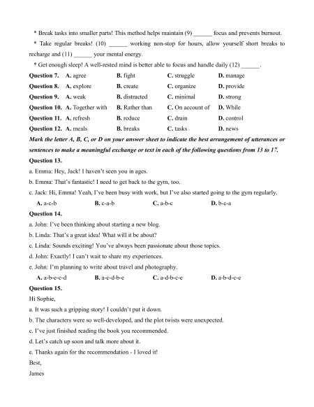 * Get enough sleep! A well-rested mind is better able to focus and handle daily (12) ______. Question 7. A. agree B. fight C. struggle D. manage Question 8. A. explore B. create C. organize D. provide Question 9. A. weak B. distracted C. minimal D. strong