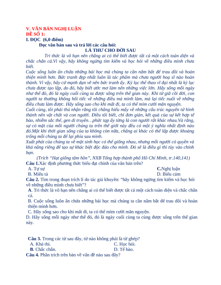 V. VĂN BẢN NGHỊ LUẬN ĐỀ SỐ 1: I. ĐỌC (6,0 điểm)