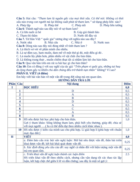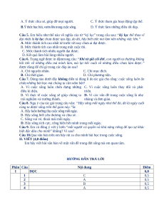 HƯỚNG DẪN TRẢ LỜI Phần Câu Nội dung Điểm I ĐỌC 6,0 1 C 0,5 2 A 0,5 3 B 0,5 4 A 0,5 5 B 0,5 6 D 0,5 7 B 0,5 8 D 0,5 9