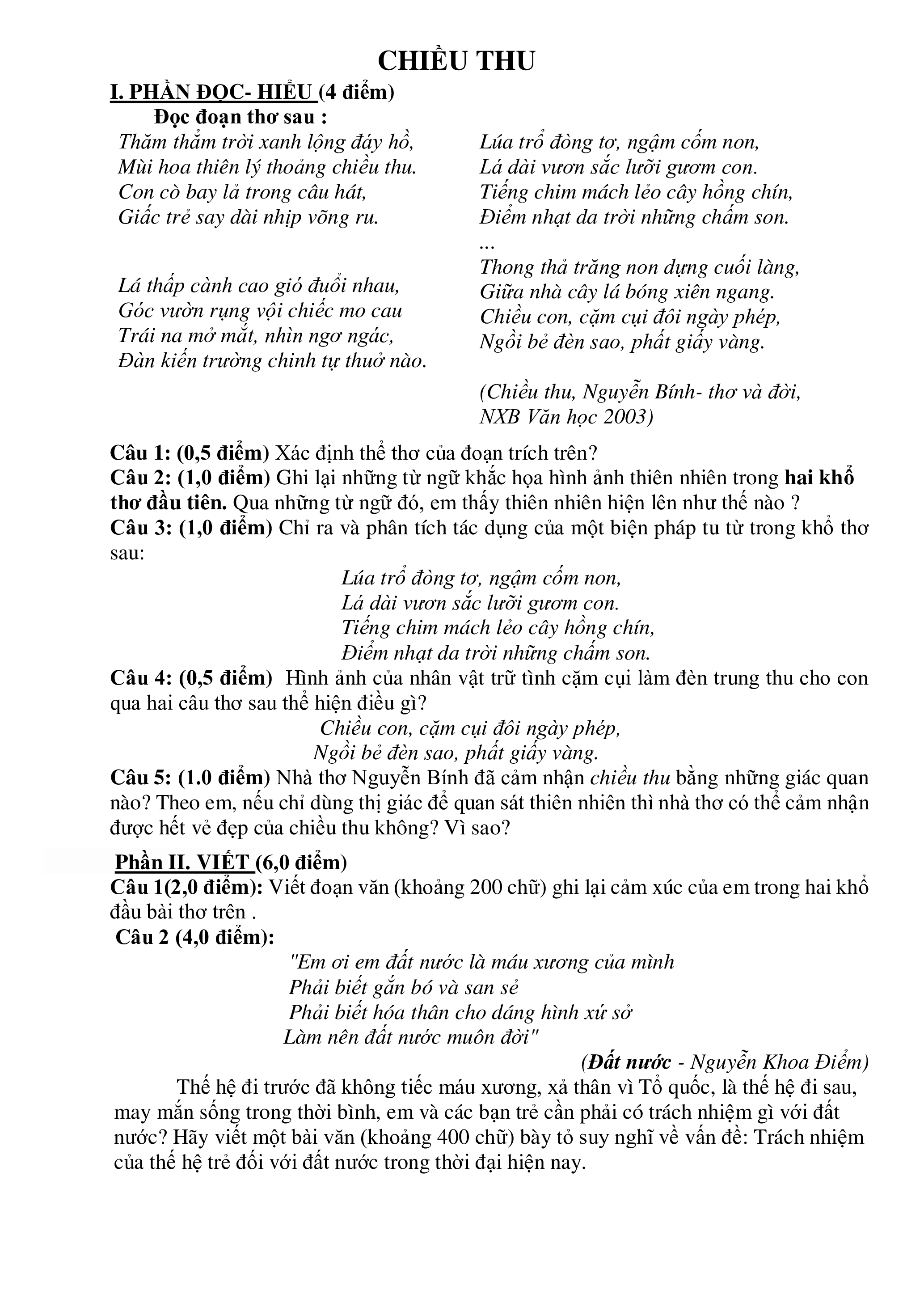 Câu 5: (1.0 điểm) Nhà thơ Nguyễn Bính đã cảm nhận chiều thu bằng những giác quan