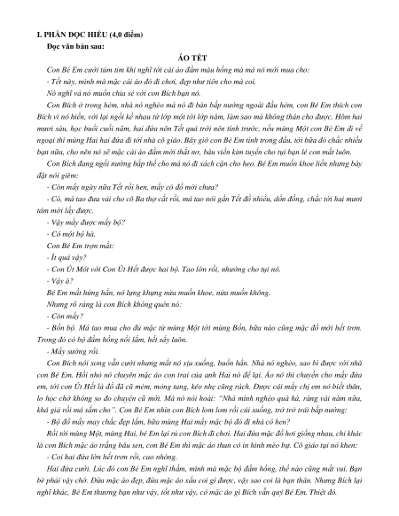 I. PHẦN ĐỌC HIỂU (4,0 điểm)