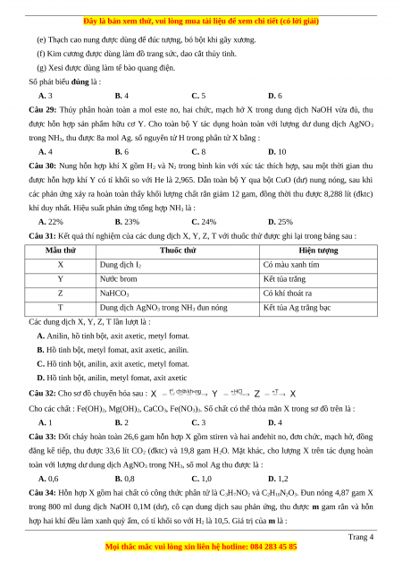 Câu 31: Kết quả thí nghiệm của các dung dịch X, Y, Z, T với thuốc thử được ghi lại trong bảng sau : Mẫu thử Thuốc thử Hiện tượng X Dung dịch I2 Có màu xanh tím Y Nước brom Kết tủa trắng Z NaHCO3 Có khí thoát ra T