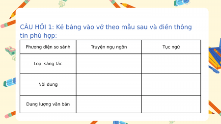 CÂU HỎI 1: Kẻ bảng vào vở theo mẫu sau và điền thông tin phù hợp: Phương diện so sánh Truyện ngụ ngôn Tục ngữ Loại sáng tác Nội dung Dung lượng văn bản