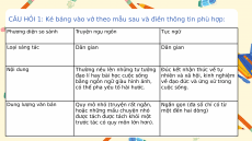 CÂU HỎI 1: Kẻ bảng vào vở theo mẫu sau và điền thông tin phù hợp: Phương diện so sánh Truyện ngụ ngôn Tục ngữ Loại sáng tác Dân gian Dân gian Nội dung