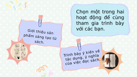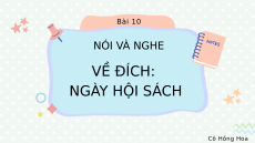 Bài 10 NÓI VÀ NGHE VỀ ĐÍCH: NGÀY HỘI SÁCH Cô Hồng Hoa Chọn một trong hai hoạt động để cùng tham gia trình bày với các bạn. Giới thiệu sản phẩm sáng tạo từ sách. Trình bày ý kiến về tác dụng, ý nghĩa của việc đọc sách. Giới thiệu sản