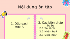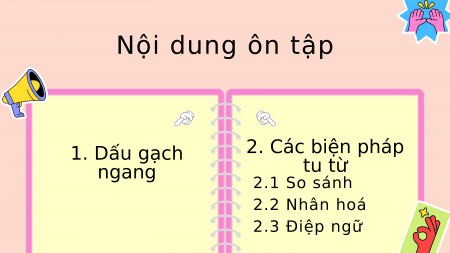 Thực hành tiếng D Ấ U C Â U V , iệ B I Ệ tN PHÁP TU T Ừ I. Nhắc lại kiến thức Nội dung ôn tập 1. Dấu gạch 2. Các biện pháp ngang tu từ 2.1 So sánh 2.2 Nhân hoá 2.3 Điệp ngữ 1. Dấu gạch ngang