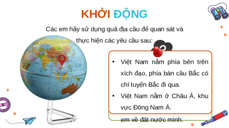 thực hiện các yêu cầu sau: • Tì V m iệt vị Natrí m cnủa ằ m Việt phí aN a b m ên trtên ê n qxuả íc hđịa đạ cầ o, u p .hía bán cầu Bắc có • V c iệ hít t N uy a ế m n n Bắ ằ c m đi q ở ua. c hâu lục • nào Việ ? t Nam nằm ở Châu Á, khu • C v h ựia c s Đ ẻ ôn n g hữ Nang m hiể Á. u biết của em về đất nước mình.