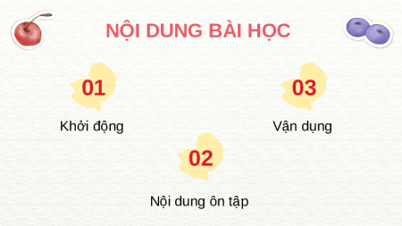 XIN CHÀO MỪNG CÁC EM ĐẾN VỚI BÀI HỌC MỚI! BÀI 11. ÔN TẬP NỘI DUNG BÀI HỌC 01 03 Khởi động Vận dụng 02 Nội dung ôn tập KHỞI ĐỘNG