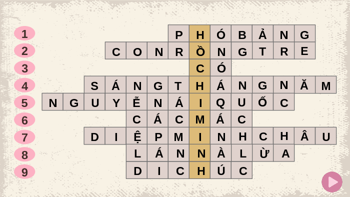chữ sẽ được điểm cộng. 1 P H Ó B Ả N G 2 C O N R Ồ N G T R E 3 C Ó 4 S Á N G T H Á N G N Ă M 5 N G U Y Ễ N Á I Q U Ố C 6 C Á C M Á C 7 D I Ệ P M I N H C H Â U 8 L Á N N À L Ừ A 9 D I C H Ú C
