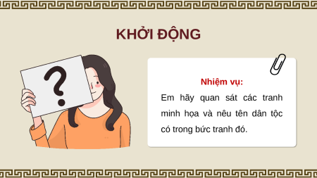 minh họa và nêu tên dân tộc có trong bức tranh đó. Dân tộc Kinh Dân tộc Tày Dân tộc Thái Dân tộc Mường Dân tộc Ba Na Dân tộc Chăm BÀI 4: DÂN CƯ VÀ