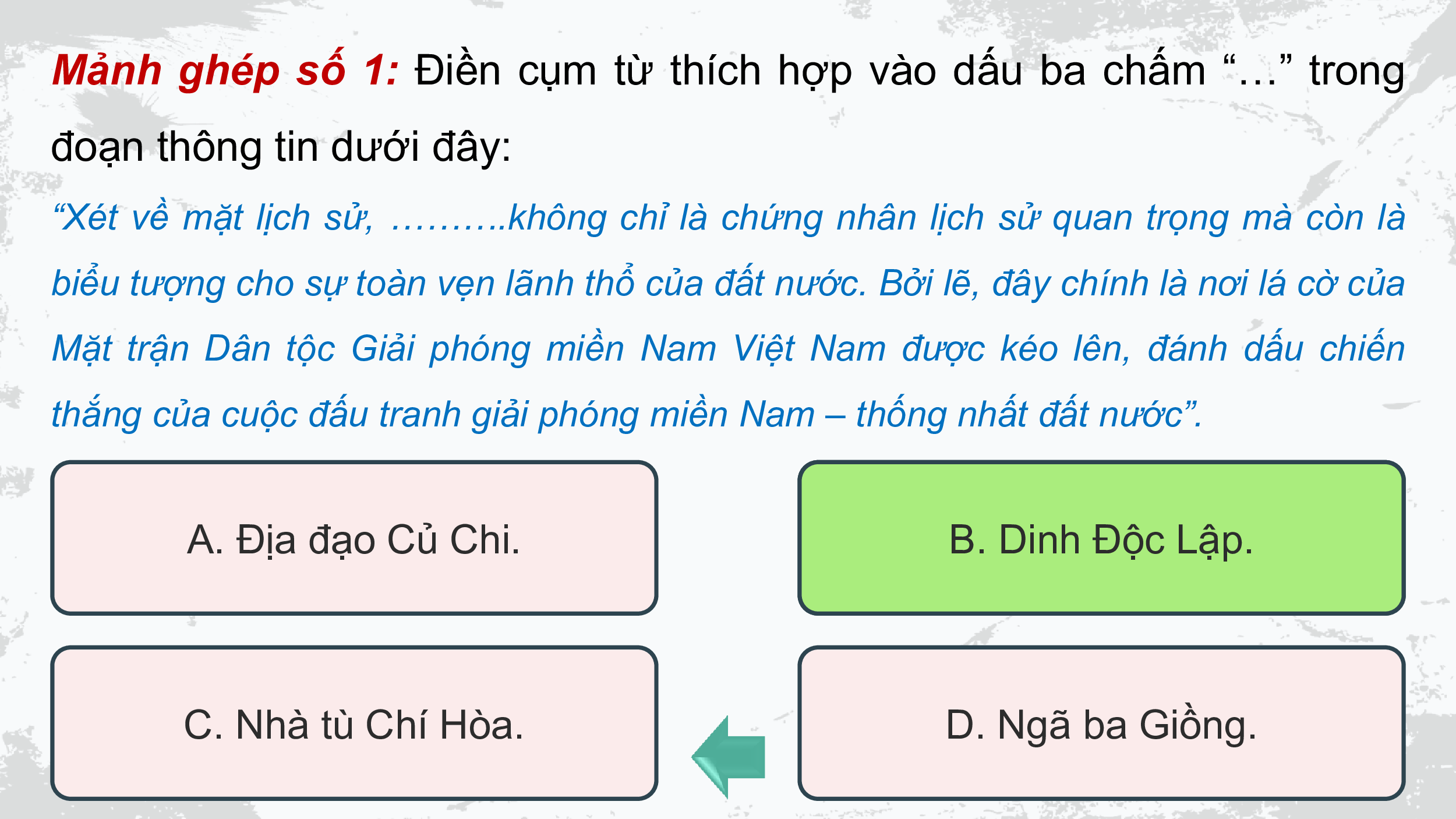 thắng của cuộc đấu tranh giải phóng miền Nam – thống nhất đất nước”. A. Địa đạo Củ Chi. B. Dinh Độc B. Lập. C. Nhà tù Chí Hòa. D. Ngã ba Giồng.