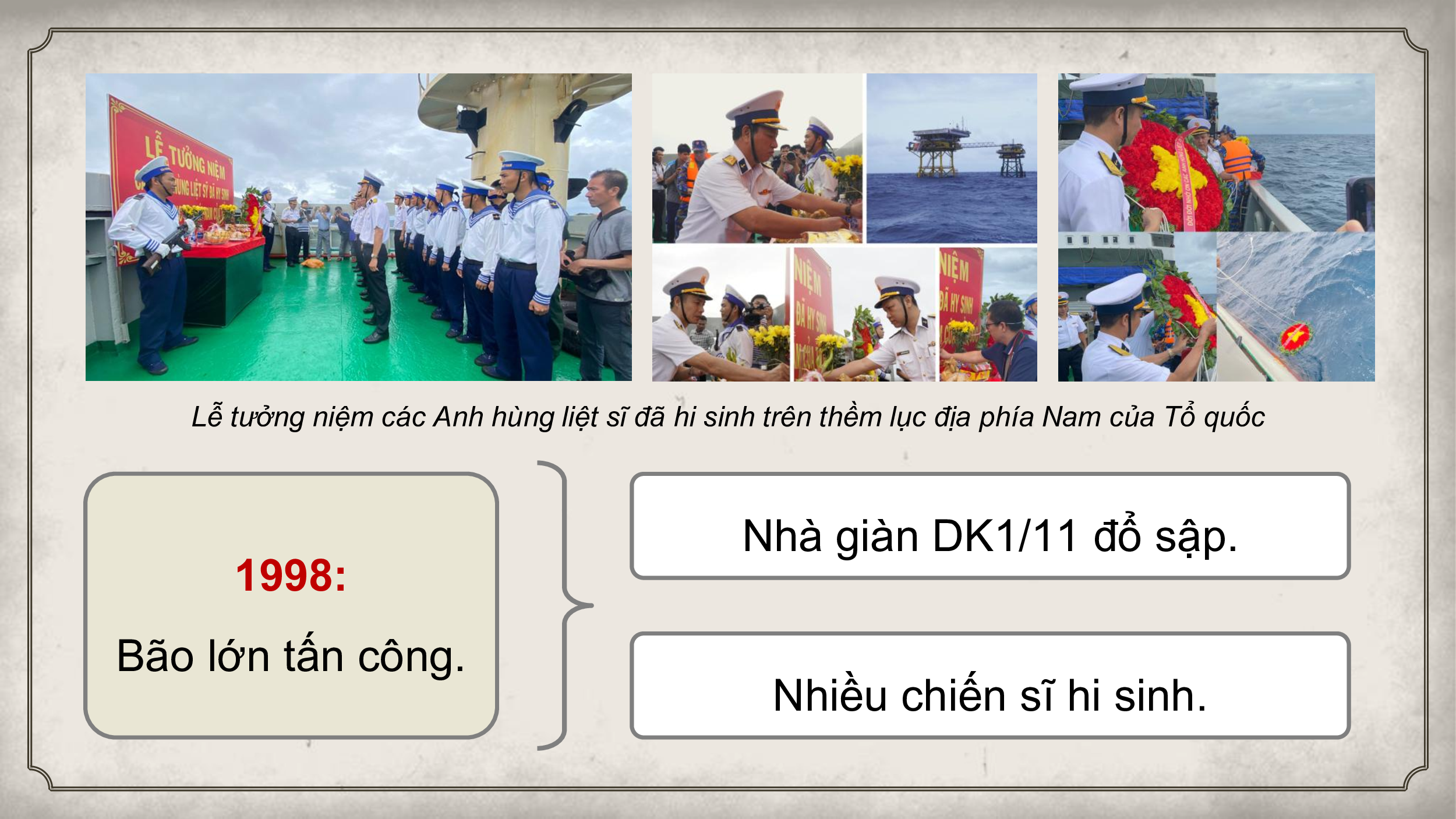 Lễ tưởng niệm các Anh hùng liệt sĩ đã hi sinh trên thềm lục địa phía Nam của Tổ quốc Nhà giàn DK1/11 đổ sập. 1998: Bão lớn tấn công. Nhiều chiến sĩ hi sinh.