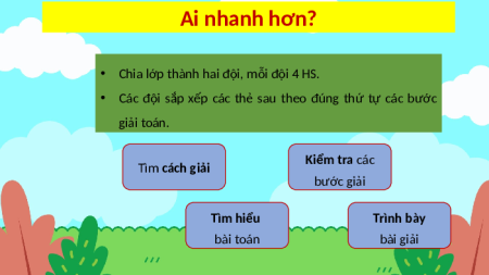 • Các đội sắp xếp các thẻ sau theo đúng thứ tự các bước giải toán. Kiểm tra các Tìm cách giải bước giải Tìm hiểu Trình bày bài toán bài giải Tìm hiểu Tìm cách giải bài toán Kiểm tra các Trình bày bước giải bài giải