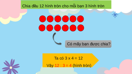 Có mấy bạn được chia? Ta có 3 x 4 = 12 Vậy 12 : 3 = 4 (hình tròn)