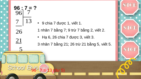 3 nhân 7 bằng 21; 26 trừ 21 bằng 5, viết 5. 5 96 : 7 = 13 (dư 5)