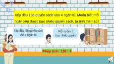ngăn xếp được bao nhiêu quyển sách, ta tính thế nào? Phép tính: 136 : 4