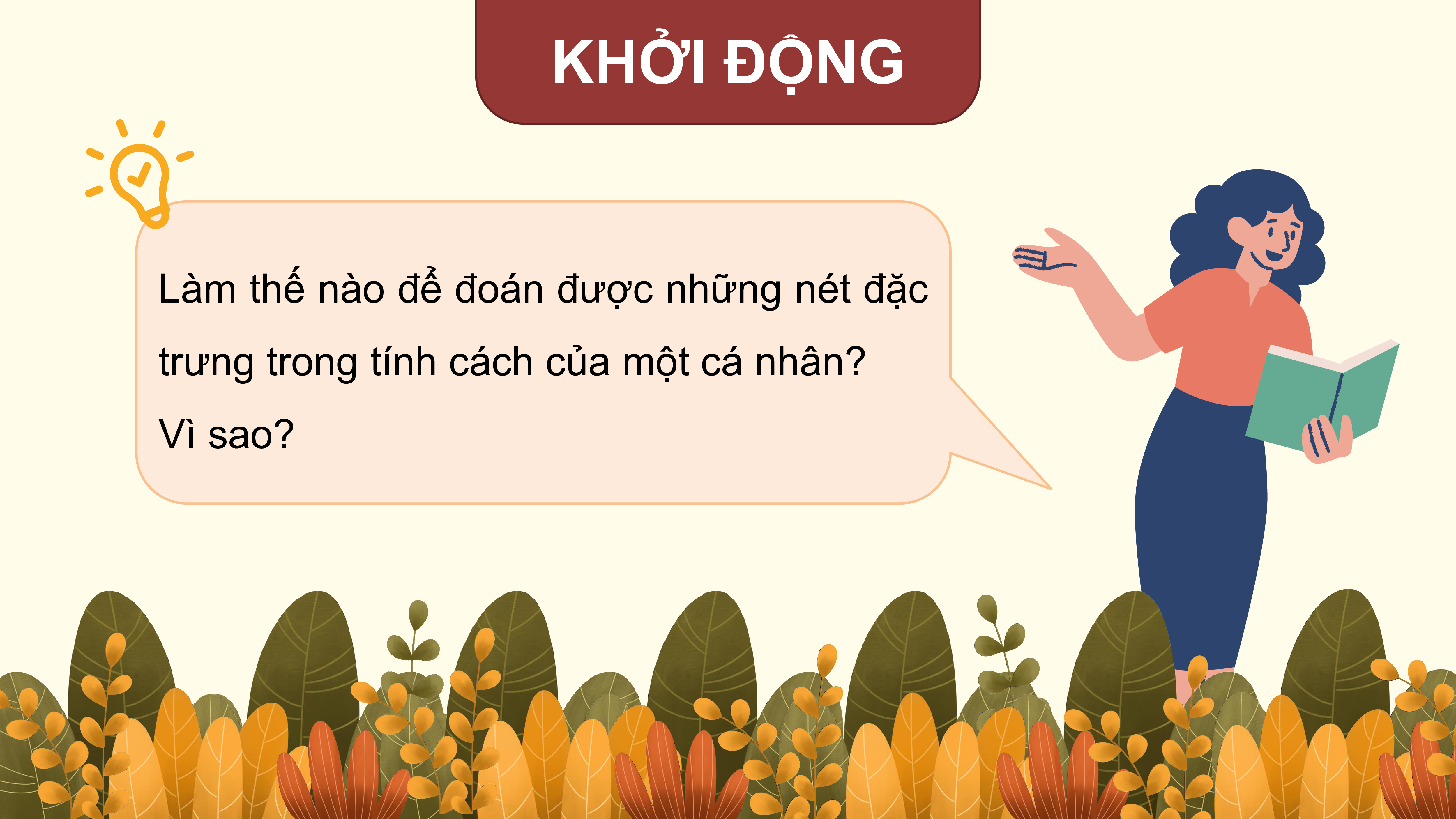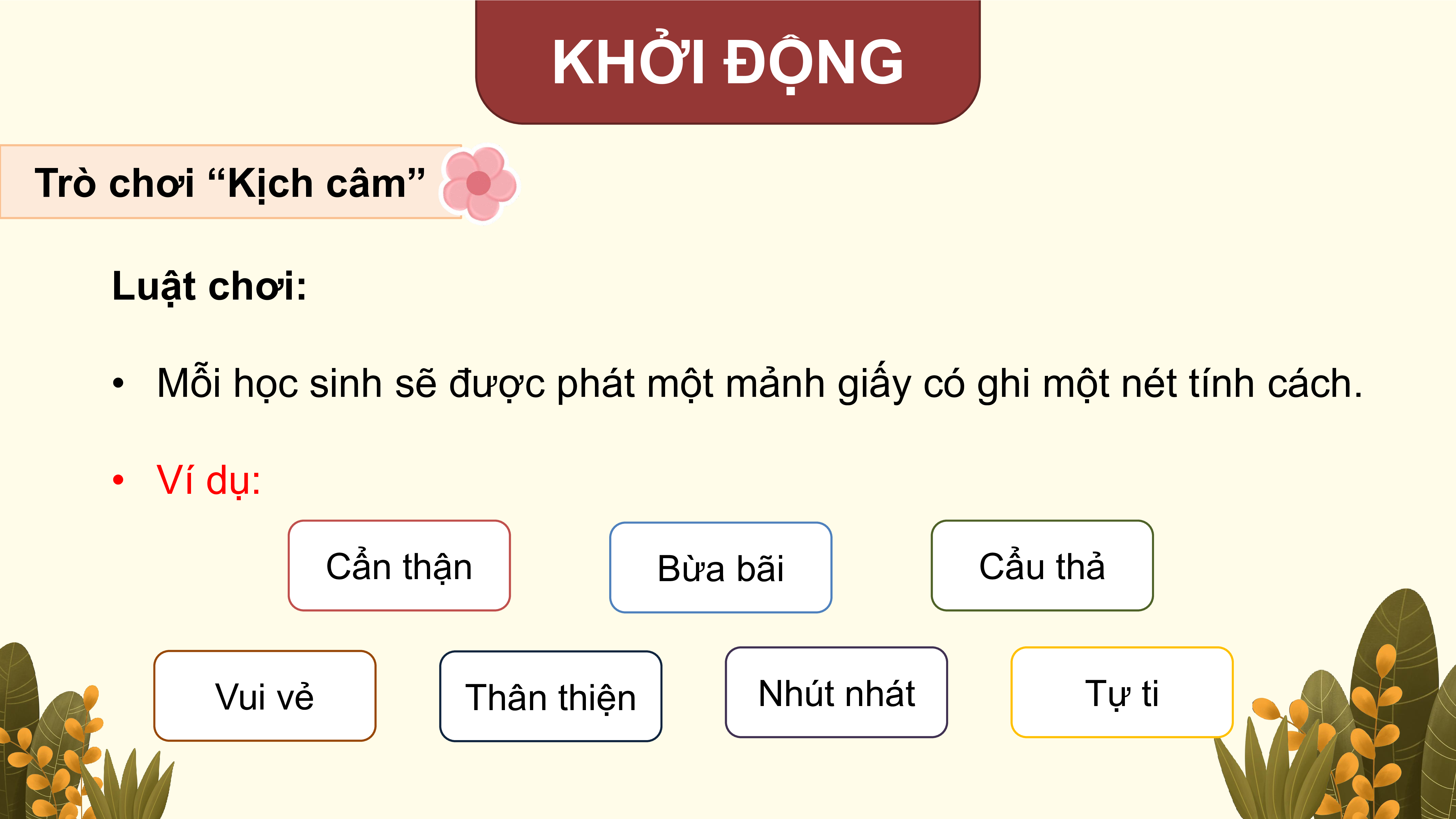 • Mỗi học sinh sẽ được phát một mảnh giấy có ghi một nét tính cách. • Ví dụ: Cẩn thận Bừa bãi Cẩu thả Vui vẻ Thân thiện Nhút nhát Tự ti KHỞI ĐỘNG