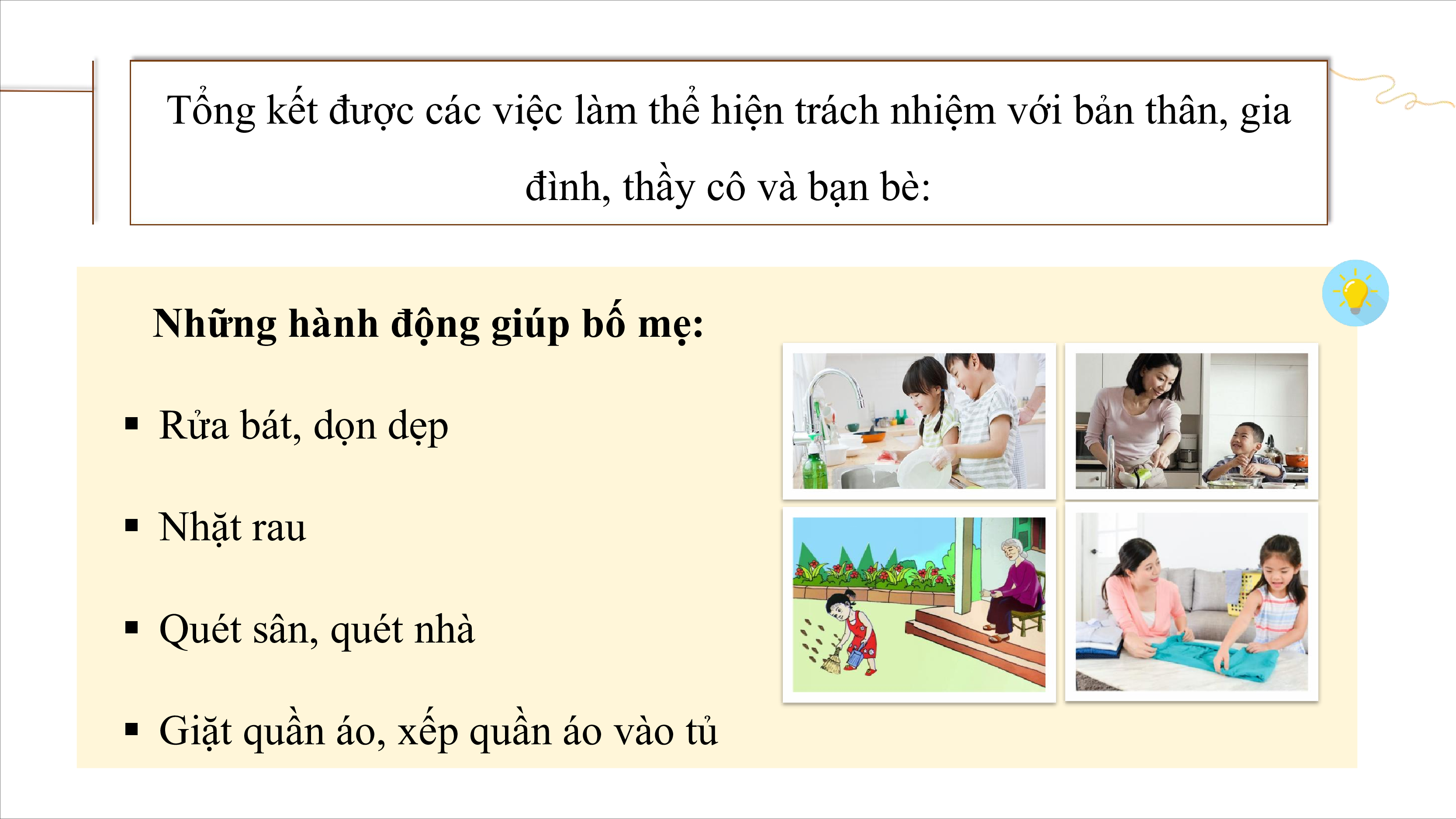 Tổng kết được các việc làm thể hiện trách nhiệm với bản thân, gia