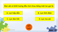 Mọi vật có khối lượng đều hút nhau bằng một lực gọi là: A. Lực hấp dẫn B. Lực tĩnh điện C. Lực đàn hồi D. Lực ma sát HẾT GIỜ