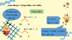 Hoạt động 1: Cộng nhẩm, trừ nhẩm 54 gồm mấy Cộng nhẩm chục và mấy 54 + 3 = ..?.. đơn vị? 4 + 3 = 7 50 + 7 = 57 50 4 54 + 30 = ..?.. 5 chục + 3 chục = 8 chục 54 + 30 = 84 50 4