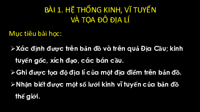 BÀI 1. HỆ THỐNG KINH, VĨ TUYẾN VÀ TỌA ĐÔ ĐỊA LÍ Mục tiêu bài học: