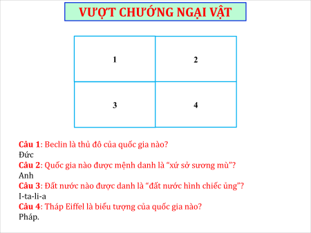 Câu 4: Tháp Eiffel là biểu tượng của quốc gia nào? Pháp. CHƯỚNG NGẠI VẬT CHÂU ÂU