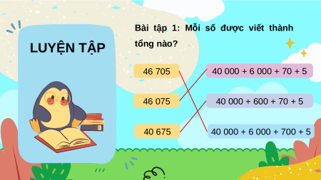 Bài tập 1: Mỗi số được viết thành LUYỆN TẬP tổng nào? 46 705 40 000 + 6 000 + 70 + 5 46 075 40 000 + 600 + 70 + 5 40 675 40 000 + 6 000 + 700 + 5