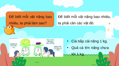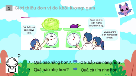 1 Giới thiệu đơn vị đo khối lượng: gam ? • Quả nào nặng hơn? Cái bắp cải nặng hơn • Quả nào nhẹ hơn? Quả cà tím nhẹ hơn.