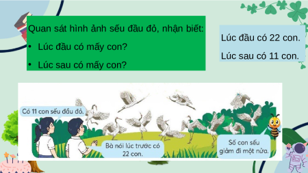 Quan sát hình ảnh sếu đầu đỏ, nhận biết: Lúc đầu có 22 con. • Lúc đầu có mấy con? Lúc sau có 11 con. • Lúc sau có mấy con? GIẢM MỘT SỐ ĐI MỘT SỐ LẦN NỘI DUNG BÀI HỌC