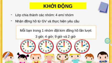 Mỗi bạn trong 1 nhóm đặt kim đồng hồ lần lượt: